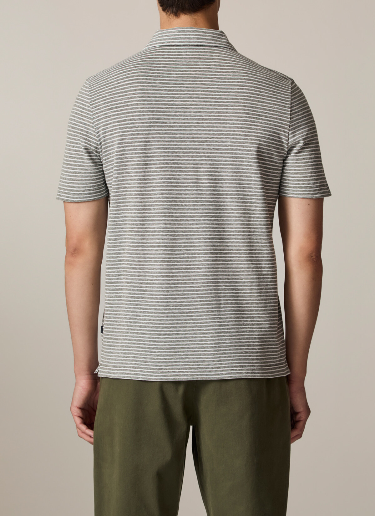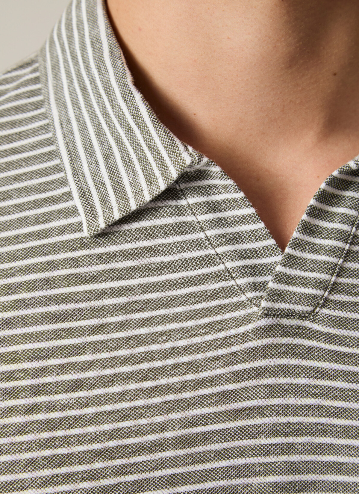 Das Polo zeigt sich im Regular Fit mit dezentem, offenem V-Ausschnitt. Material: die Baumwoll-Leinen-Mischung kombiniert die Atmungsaktivität der Baumwolle mit der kühlenden Leichtigkeit von Leinen für optimalen Komfort bei warmem Wetter. Optik: Das Streifenmuster verleiht dem Polo eine moderne und gleichzeitig zurückhaltende Ausstrahlung. Haptik: griffig und angenehm weich auf der Haut an. Styling-Tipp: Kombiniert mit einer schlichten Chino oder Jeans entsteht ein klassischer, dennoch zeitgemäßer Look.