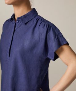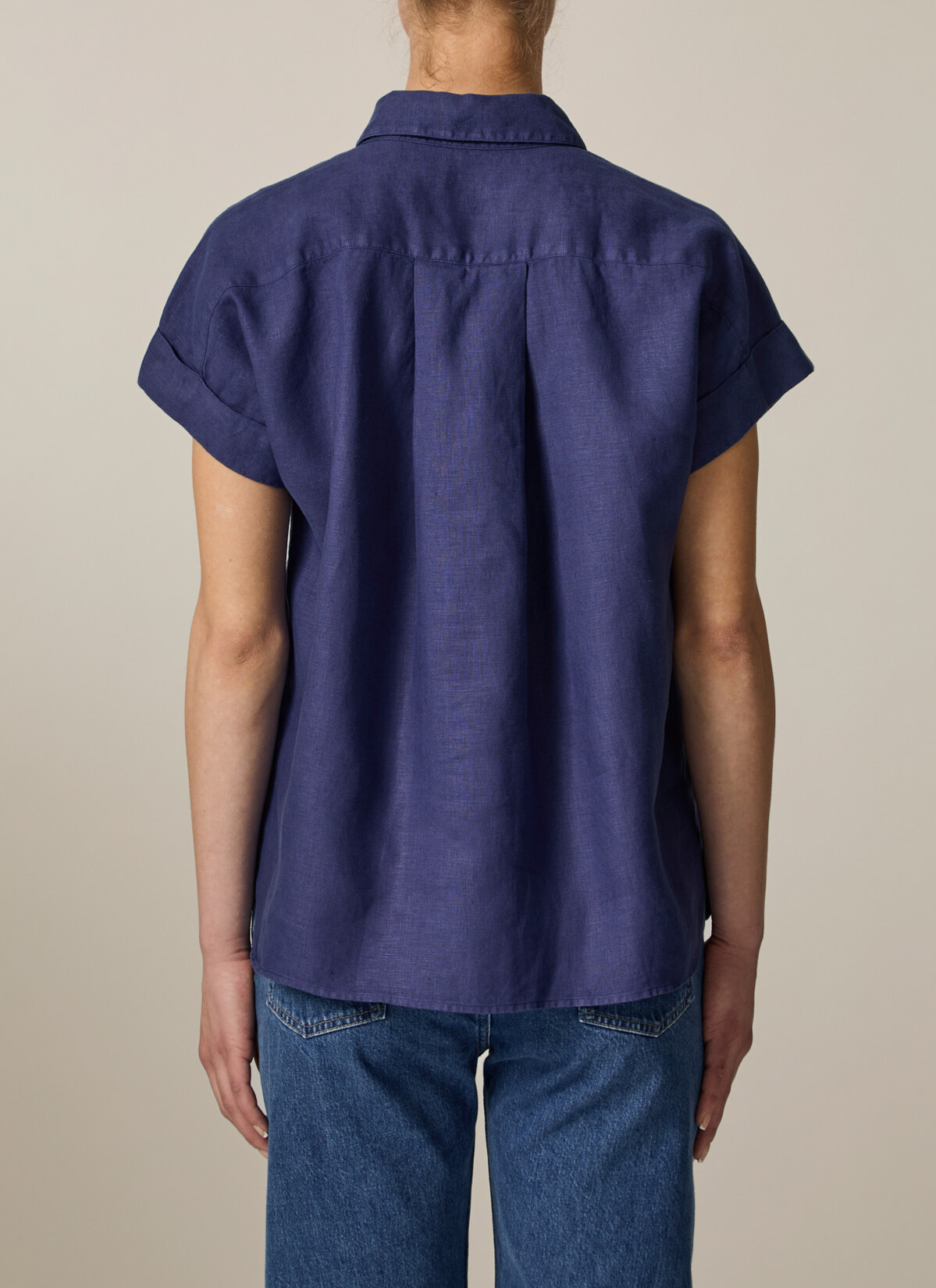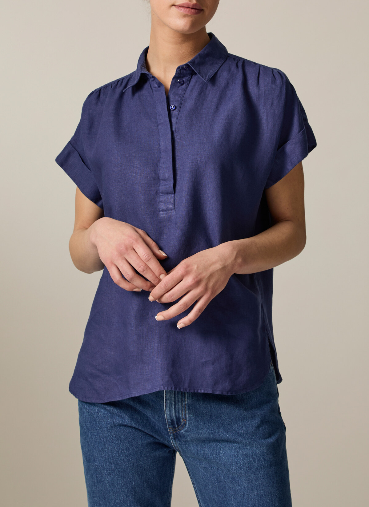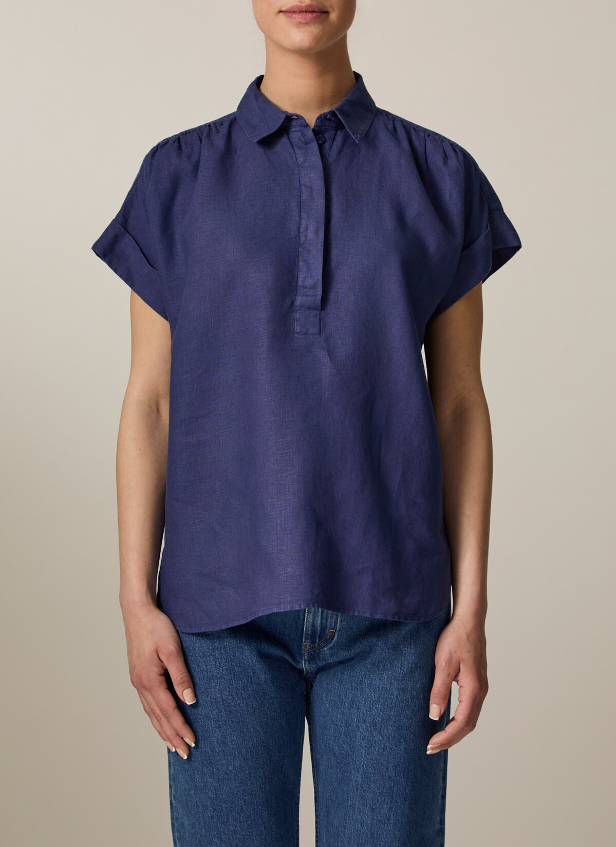 Die Kurzarm Bluse im Relaxed Fit zeigt sich mit überschnittenen Schultern und verdeckter, halber Knopfleiste. Die Falten an den Schultern geben der Bluse eine schöne, leichte Struktur und unterstreichen ihren entspannten Look während die Quetschfalte auf der Rückseite der Bluse einen femininen Touch verleiht. Material: gefertigt aus Leinen ist die Bluse wunderbar kühlend und atmungsaktiv. Haptik: kernig und kühl im Griff. Styling-Tipp: kombiniert im Set mit der passenden Shorts (Art. Nr.: 162200) wirkt der Look besonders stimmig. Good to know: durch den Garment Dye Färbeprozess ist jedes Stück ein Unikat.