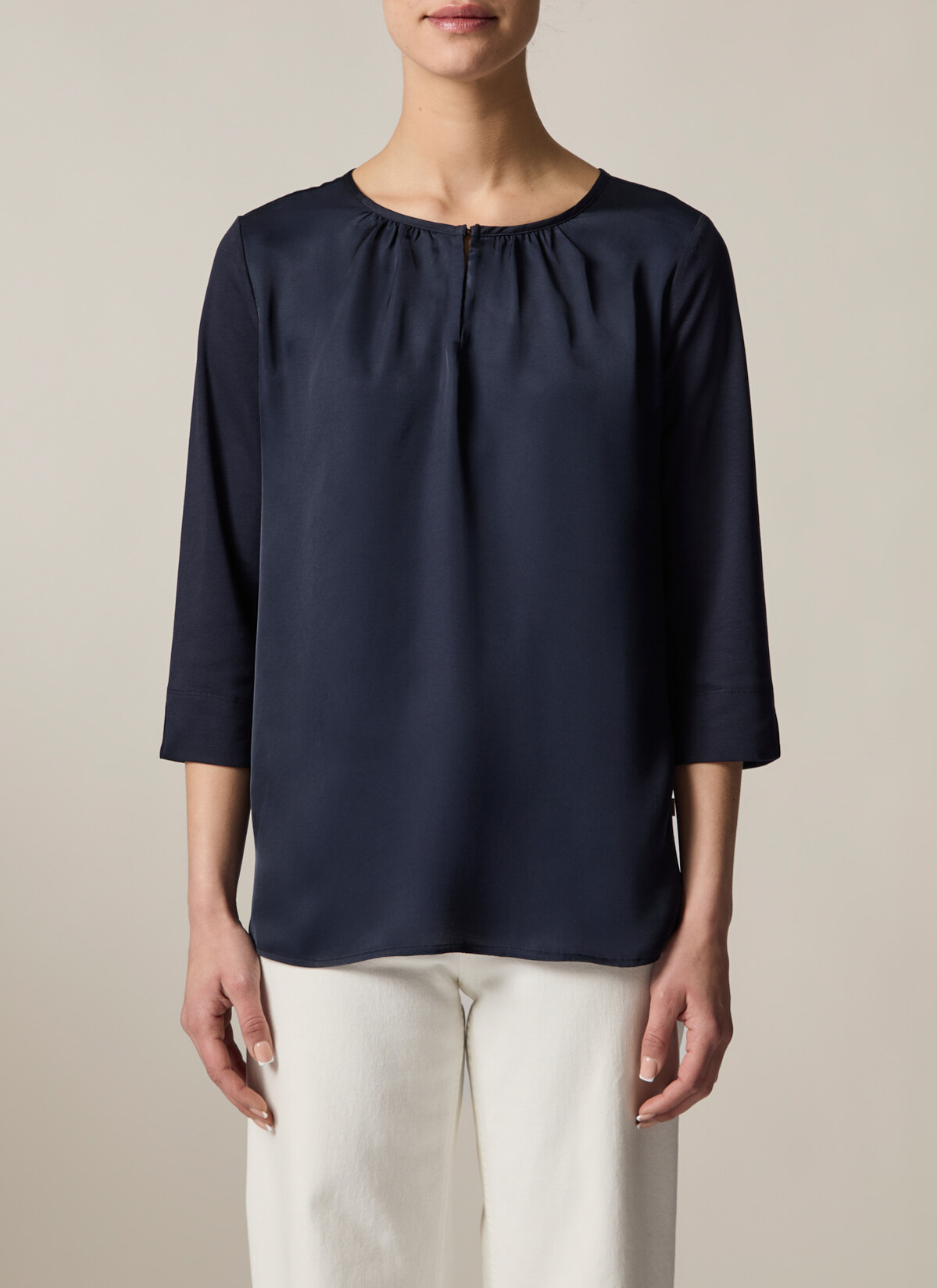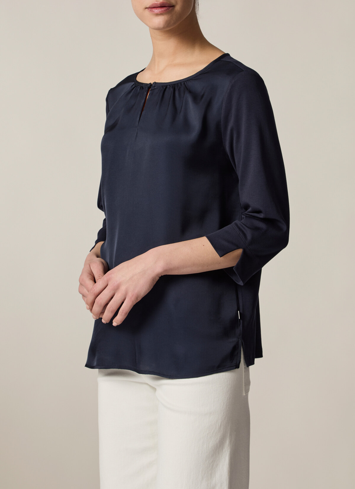 Die Rundhalsbluse im Modern Fit überzeugt mit Zierfalten auf der Vorderseite sowie einer femininen Kellerfalte auf der Rückseite. Das Vorderteil aus fließender Viskose und die Rückseite aus weicher Baumwolle sorgen für einen gelungenen Materialmix. Material: Der Mix aus Viskose und Baumwolle bietet ein angenehmes Tragegefühl und ist dabei atmungsaktiv. Haptik: leicht und glatt im Griff. Styling-Tipp: Das Shirt lässt sich sowohl zu Jeans als auch zu Stoffhosen kombinieren und eignet sich so für verschiedene Anlässe.