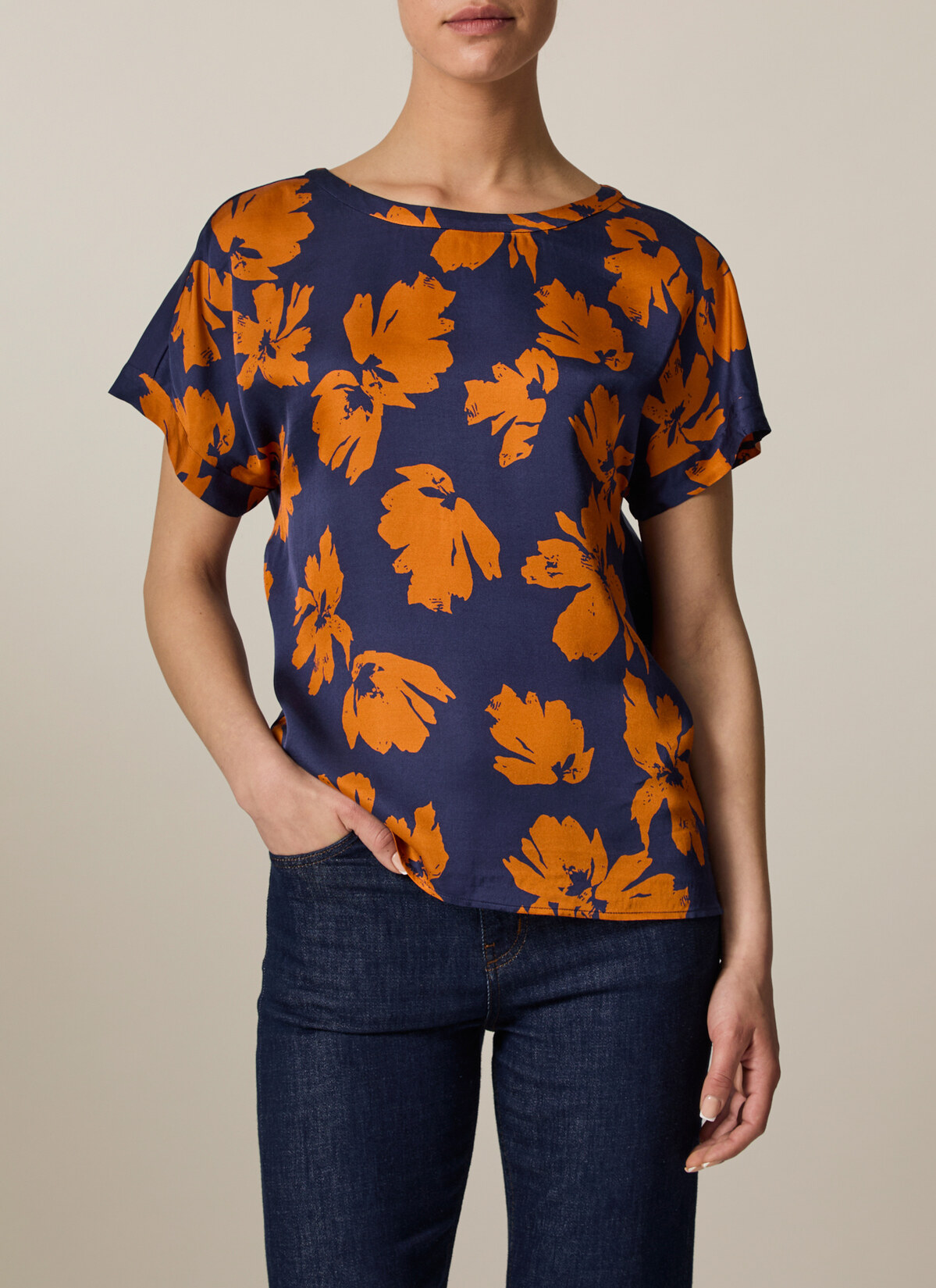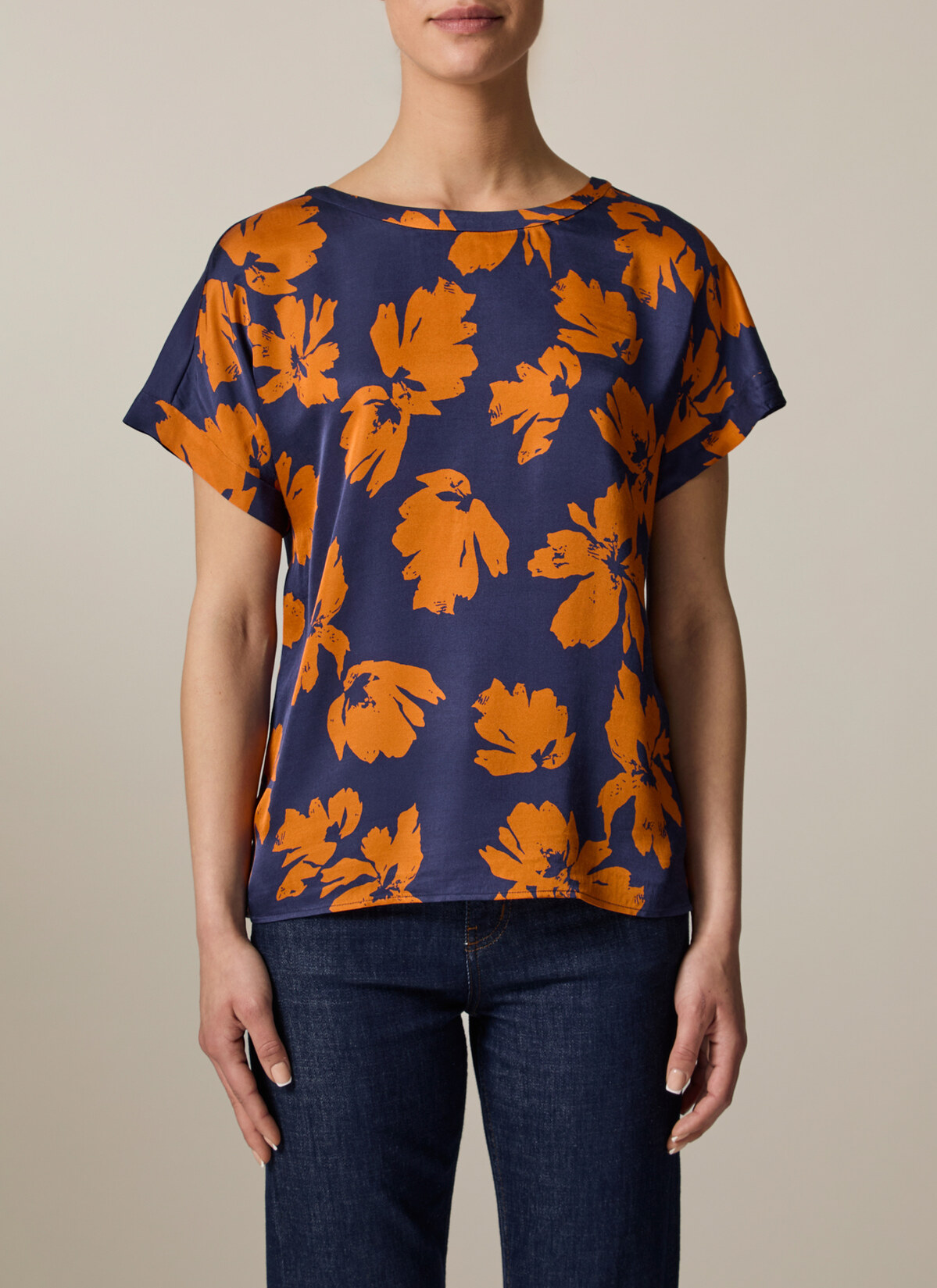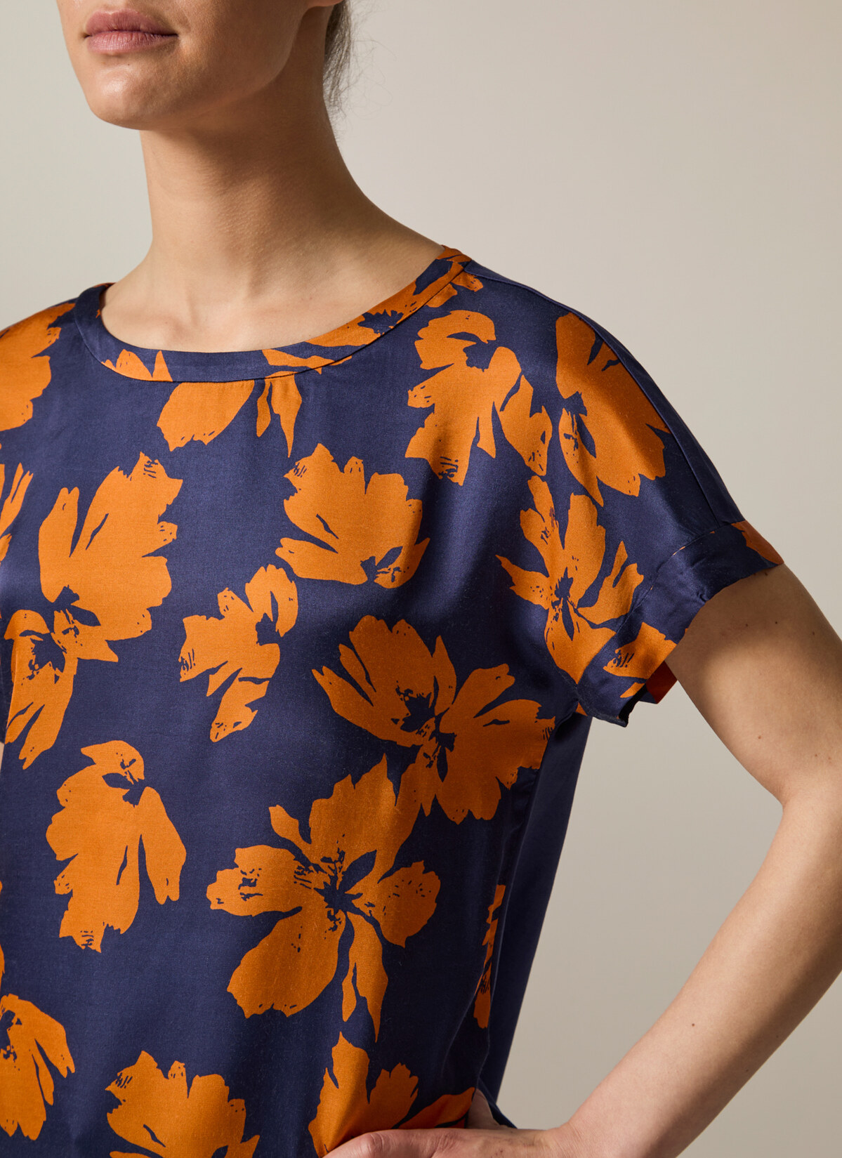 Die Rundhalsbluse im Modern Fit überzeugt mit überschnittenen Schultern und einem femininen Schnitt. Das Vorderteil aus fließender Viskose mit floralem Statement Muster und die Rückseite aus weicher Baumwolle sorgen für einen gelungenen Materialmix. Material: Der Mix aus Viskose und Baumwolle bietet ein angenehmes Tragegefühl und ist dabei atmungsaktiv. Haptik: leicht und glatt im Griff. Styling-Tipp: Das Shirt lässt sich sowohl zu Jeans als auch zu Stoffhosen kombinieren und eignet sich so für verschiedene Anlässe.