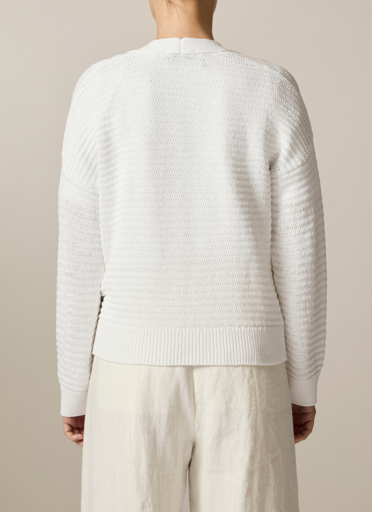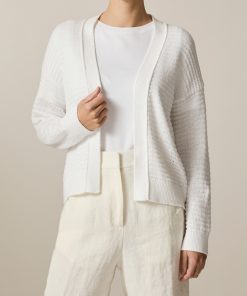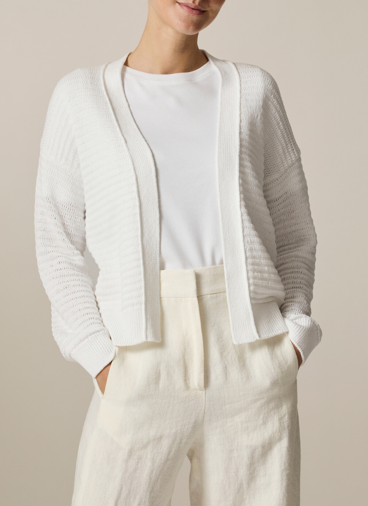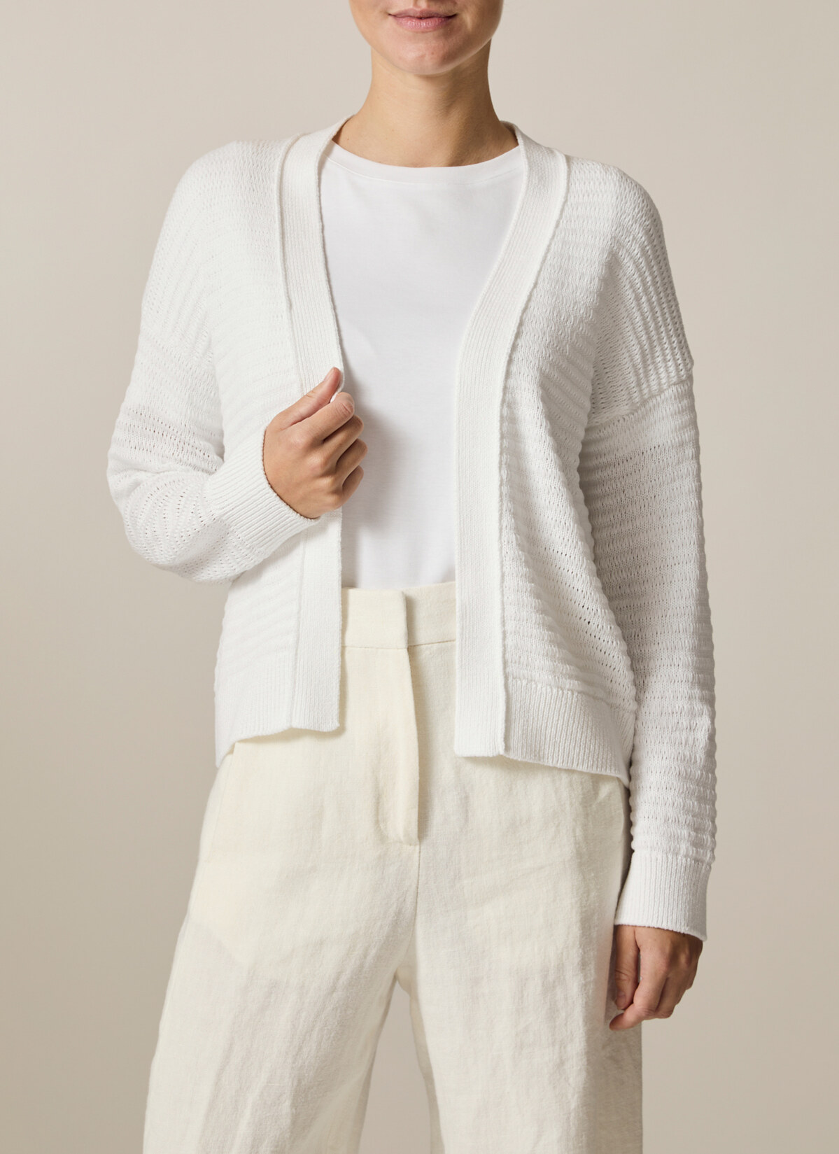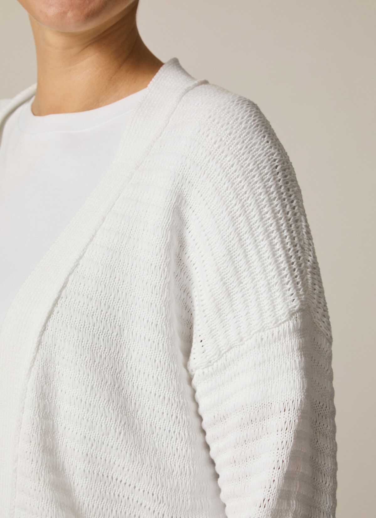 Die Strickjacke im Modern Fit präsentiert sich mit überschnittenen Schultern und einer auffälligen Statement-Struktur. Der offene Schnitt ohne Knöpfe sorgt für einen entspannten, modernen Look. Material: gefertigt aus 100% Bio-Baumwolle ist der Pullover hautfreundlich und kühlend. Haptik: weich und kompakt im Griff. Styling-Tipp: ideal über einem schlichten Kleid oder kombiniert mit einer Jeans für einen entspannten Alltagslook.